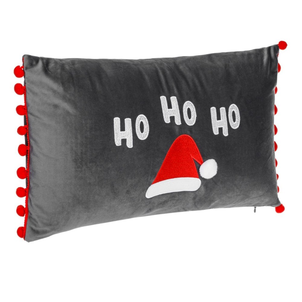 Perna Decorativă Crăciun, Antracit, Căciula Moșului Brodată, Pompoane Roșii, 50x30cm, Poliester