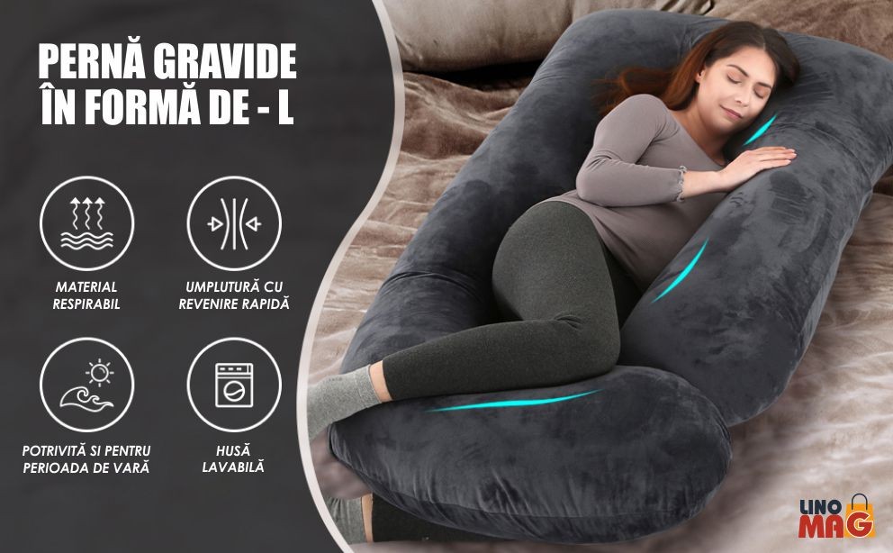 Perna Gravide si Alaptare 3 in 1 Linomag®, Multifunctionala, Forma de L, Sustinere pentru Burta, Spate, Solduri, Picioare, Bebelus, Relaxare, Husa det