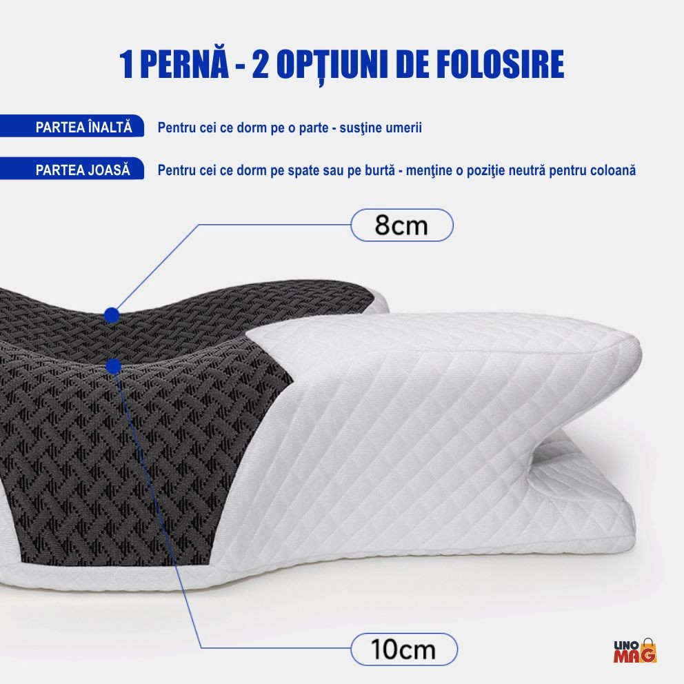 - 2 ÎNĂLȚIMI ȘI DESIGN DE SPRIJINIRE A BRAȚELOR: Nu gasești înălțimea de pernă potrivita? Perna cervicală Linomag® are 2 înălțimi diferite, pe ambele părți, astfel încât să poți alege înălțimea perfectă pentru poziția ta de somn preferată. Designul unic cu caneluri permite brațelor să treacă pe sub pernă pentru un somn confortabil. Această pernă ortopedică este potrivită pentru toate pozițiile de somn, cum ar fi dormitul pe burtă, pe spate sau pe o parte.