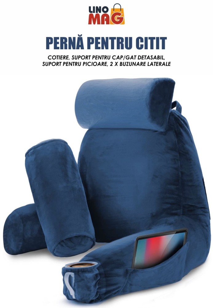 Perna pentru Citit cu Cotiere, Suport pentru Cap/Gat Detasabil & Suport pentru Picioare, Linomag®, 2 x Buzunare Laterale, Albastru, 91.5x75cm
