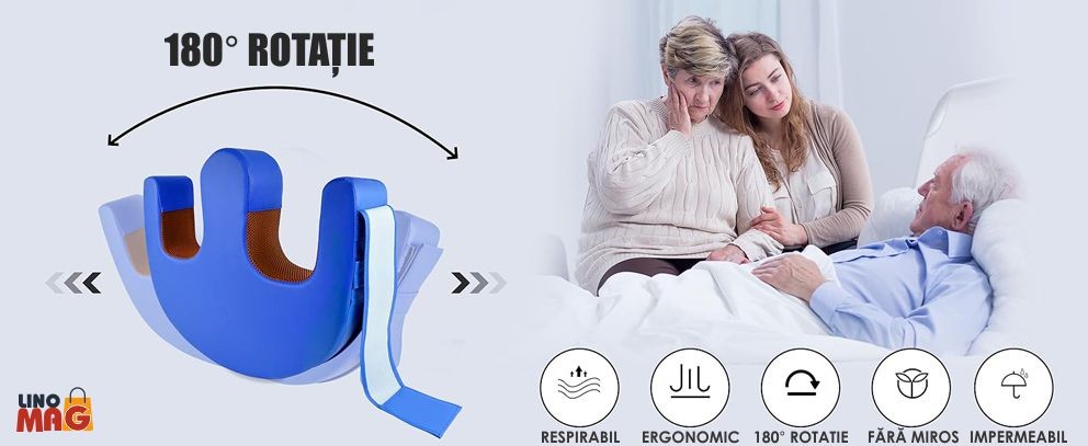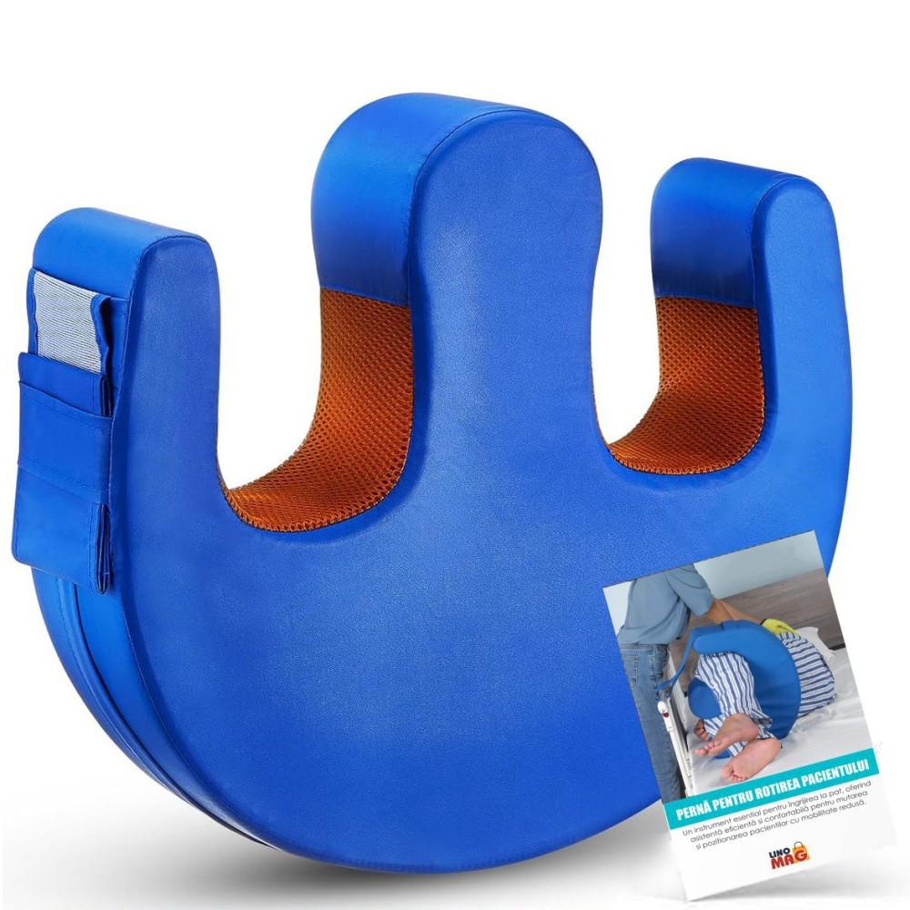 Perna pentru intoarcerea pacientilor imobilizati la pat, Linomag®, Rotire 180°, Banda de Fixare pentru Pat, Maner, Impermeabila, Albastru