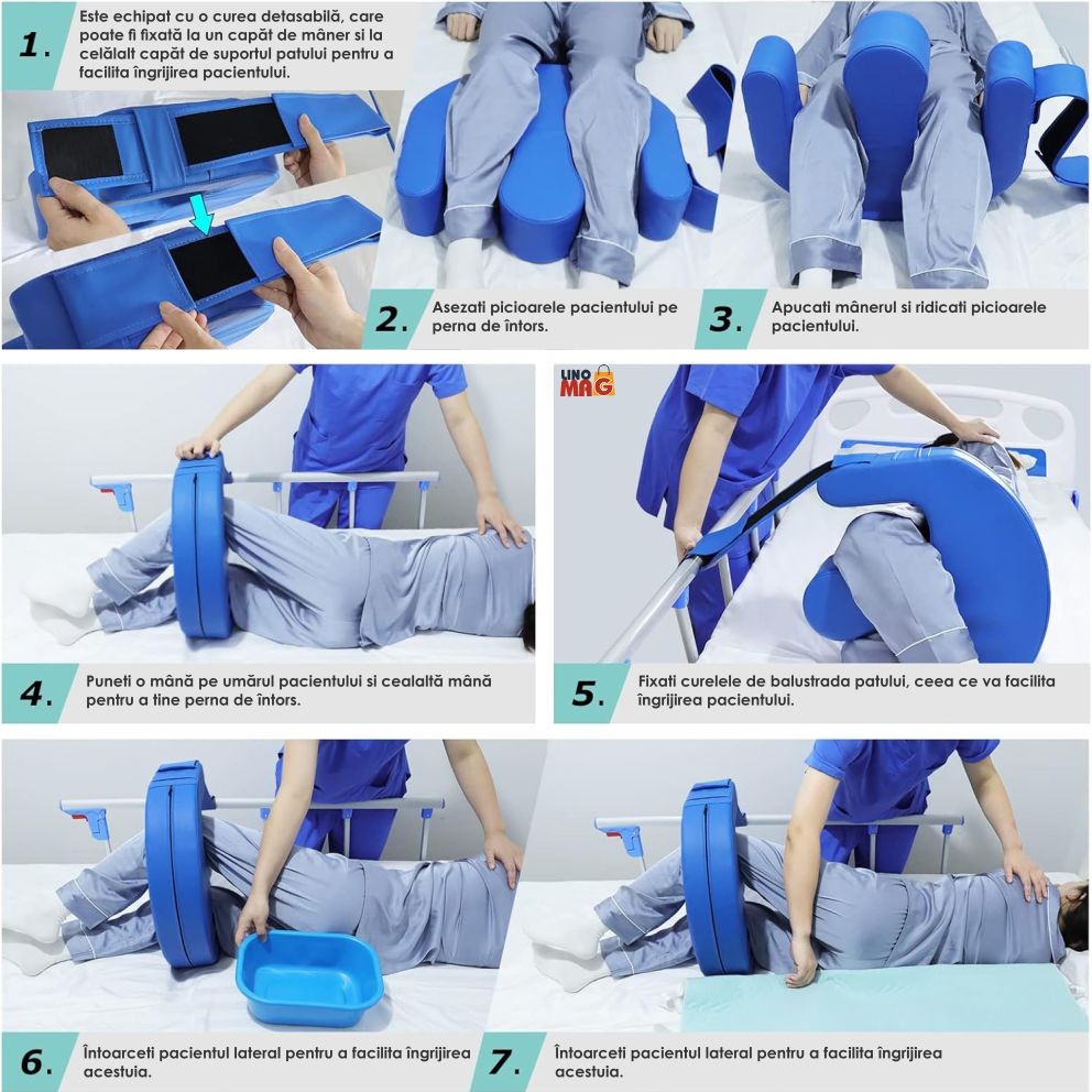 - Folosiți cureaua laterală a pernei pentru a fixa pacientul de pat, oferind stabilitate în timpul întoarcerii.