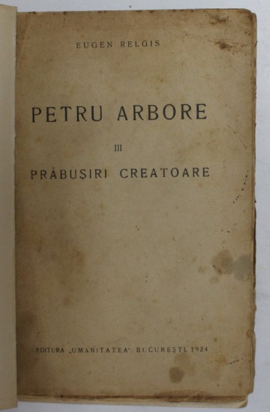 PETRU ARBORE , PARTEA A III -A - PRABUSIRI CREATOARE de EUGEN RELGIS , 1924, PREZINTA PETE SI URME DE UZURA , LIPSA COPERTA ORIGINALA