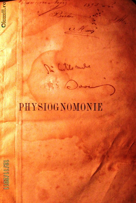 La Physiognomonie par Johann Kaspar Lavater - ed. in franceza, Paris, 1880 (prima editie a fost in 1807) - cuprinde si un capitol de Grafologie si unul de Chiromantie - 538 lithografii si desene dupa gravurile din editia princeps, 508 pg. unele patate de umezeala - lipsa frontispiciul si ultima fila a cuprinsului pg. 507-508, legatura de epoca putin defecta la cotor - interesanta dar si rara - a apartinut Roxandrei Negri (autograf, 1895, Barlad) si Mariei Krupenski-Negri (autograf). Cuprinde capitolele: Introducere, Notita Istorica in Arta Chyromantiei, Rasele umane, Proportiile corpului uman,Forme Physiognomice, Forme dupa moarte, Concordanta trasaturilor faciesului, Creierul, Craniul, Figura, Profilul, Ridurile, Ochii, Privirea, Nasul, Gura, Dintii, Urechea, Expresia generala a fetei, Mainile, Picioarele, Parul si Coafura, Barbia, Mustata, Vocea, Limbajul, Mirosul, Atitudinea, Graphologia, Bolile, Nebunia, Costumul, Incaltamintea, Schite de caz.