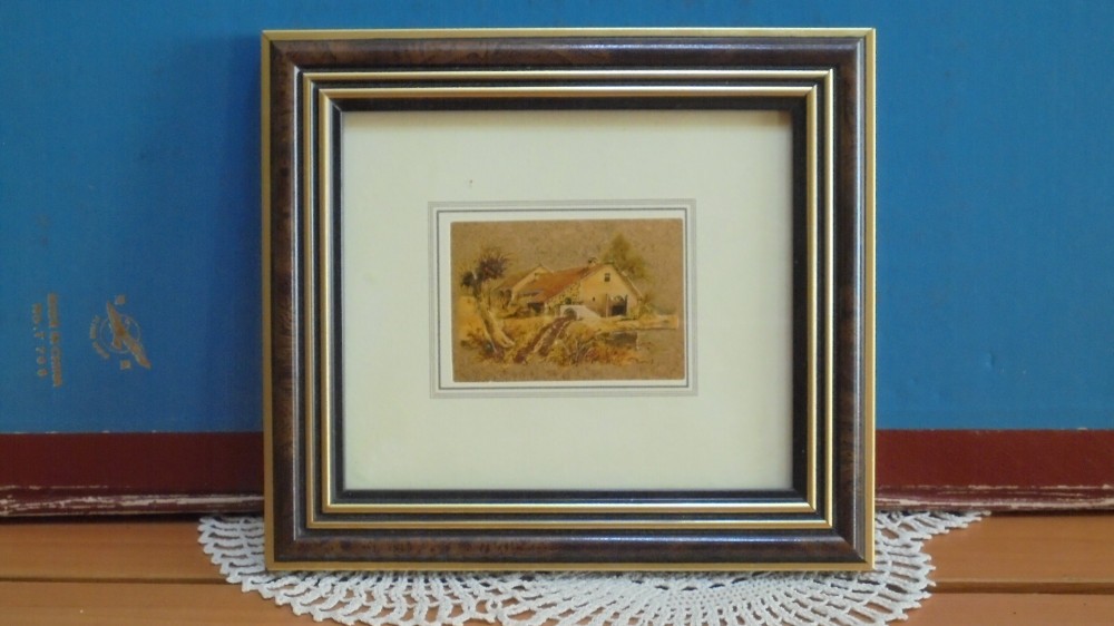 PICTURA PE HIRTIE AURITA, PEISAJ SATESC - INRAMATA, 17/15 cm.