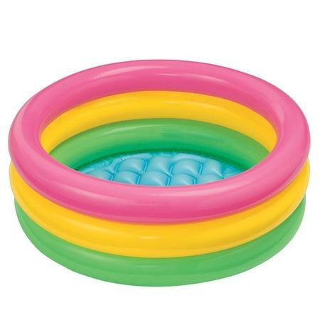 Piscina gonflabila pentru copii, inele colorate,UBX , 61 x 22 cm Majoritatea copiilor adora sa se joace cu si in apa, fie ca este vorba de cadita de acasa, cu apa calda, sau o piscina cu apa racoroasa pe timp de vara. Este o bucurie a simturilor pentru copii sa simta apa, stropii, sa priveasca miscarile apei. Piscina gonflabila Sunset glow este confectionata din vinil, compusa din 3 inele gonflabile, viu colorate. Diametru piscinei este 61 cm, iar inaltimea 22 cm. Capacitatea de apa necesara umplerii (aprox. 80%) este 45 litri. Pompa pentru umflat nu este inclusa in pret. Utilizarea acestei piscine de catre copii se face sub atenta supraveghere a adultilor.