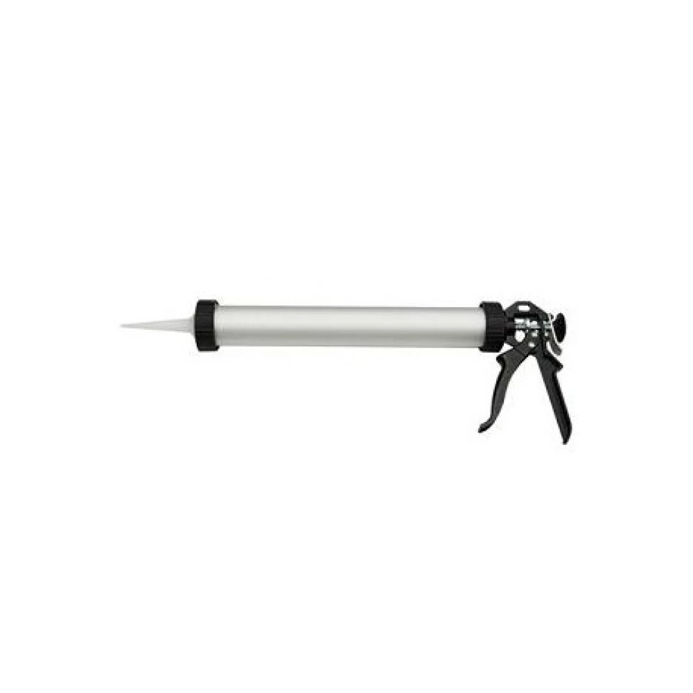 Pistol manual metalic pentru aplicarea izolantilor si adezivilor din ambalajele tip “salam” 400-600 ml. Beneficii • Structura si elemente in miscare din metal rezistent • Tija nedintata cu eliberarea rapida a tragaciului la sfarsitul cursei pistolului • Robust si usor de utilizat • Rata de impingere: 18:1 Un pistol profesional care minimizeaza forta necesara pentru a livra materiale cu vascozitate ridicata, permitand o livrare uniforma si continua a sigilantului, rezultand o aplicare de inalta calitate. Manerul si parghia de eliberare indeplinesc toate cerintele ergonomice, asigurand confort pe termen lung. Fabricat din aluminiu cilindrul permite pistonilor special proiectati sa utilizeze pe deplin materialul fara a lasa reziduuri.