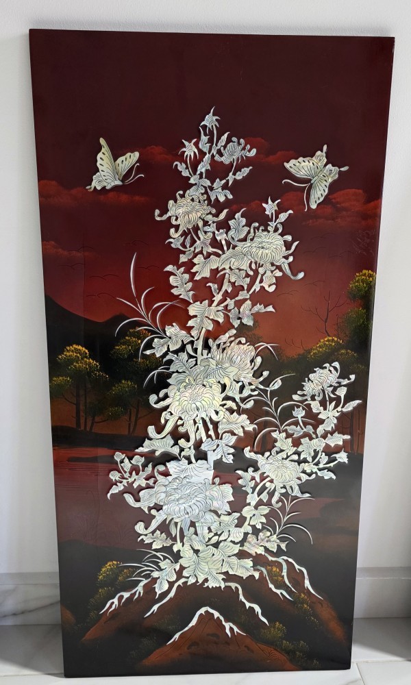 Placă decorativă vintage cu intarsie din sidef natural pe placă de lemn de inspirație asiatică. Realizată manual din lemn lăcuit, cu aplicații din sidef natural montat în intarsie. Fundal pictat manual. Motivele florale și păsările sunt realizate din sidef decupat și gravat fin, aplicat în relief.