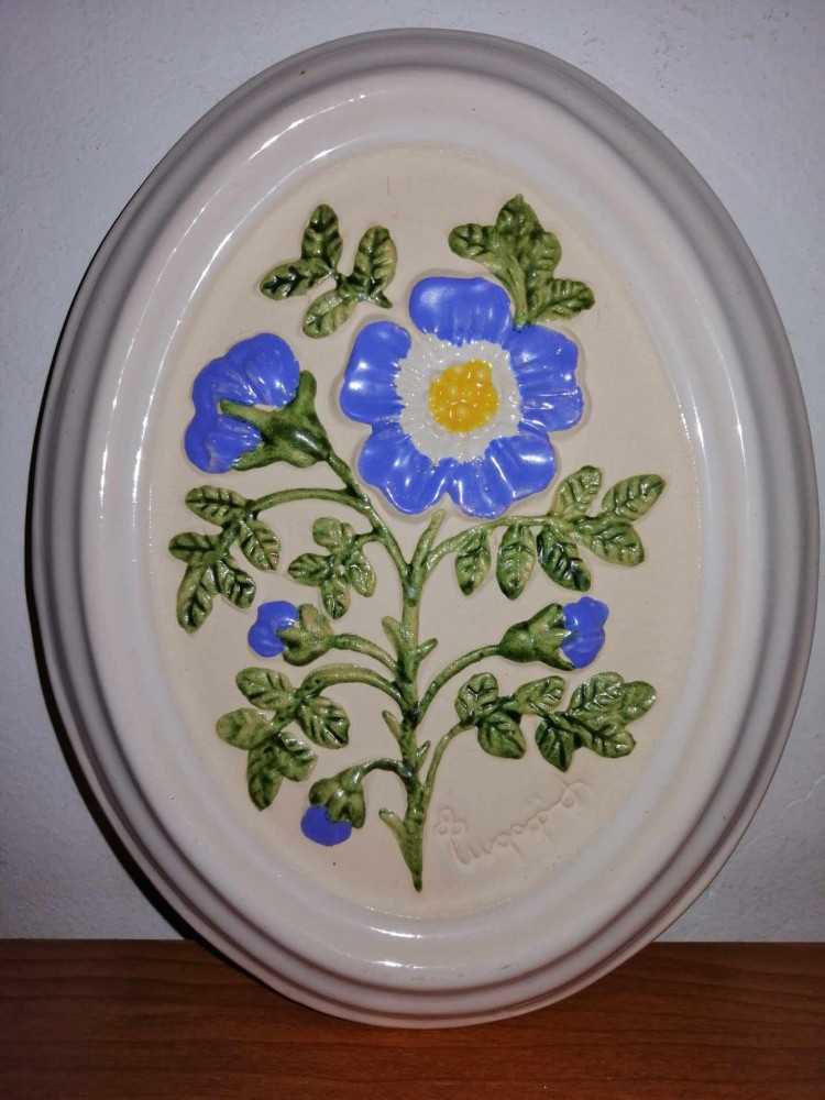 Placa tablou ceramica aplica perete ovala flori albastre Gabriel Sweden Suedia