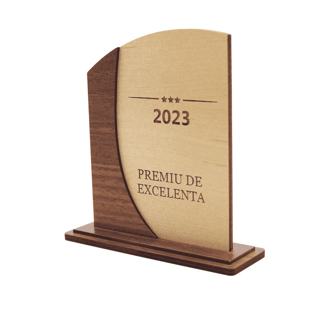 Placheta din lemn personalizabila - Cadouri Unice si Elegante Plachetele din lemn personalizabile sunt create din lemn de calitate superioara si sunt disponibile intr-o varietate de modele si dimensiuni. Plachete de lemn gravate cu texte, logo-uri sau imagini, oferindu-va posibilitatea de a crea un cadou unic si personalizat (trofee personalizate din lemn). Material: Lemn de calitate superioara, disponibil in diverse esente (stejar, fag, nuc etc.). Design: Stiluri elegante si moderne, cu optiuni variate de personalizare. Personalizare folosind gravura cu text, logo-uri, imagini si date speciale. Dimensiuni:L:15cm, h:16cm, l:5cm Unicitate: Fiecare placheta este personalizata pentru a crea un cadou cu adevarat unic. Versatilitate: Ideala pentru ceremonii de premiere, evenimente corporate, aniversari si multe altele. Calitate superioara: Materialele de inalta calitate si gravura precisa asigura un produs durabil si estetic. Recunoastere eleganta: Plachetele noastre sunt create pentru a exprima aprecierea si recunoasterea intr-un mod elegant si rafinat. Plachetele din lemn personalizabile sunt perfecte pentru diverse ocazii, cum ar fi: premii corporative, recunoasterea meritelor, cadouri de aniversare, trofee sportive, sau ca simbol de apreciere pentru realizari deosebite. Ce tipuri de personalizare sunt disponibile? Oferim gravura cu text, logo-uri, imagini si mesaje speciale. Ne puteti contacta pentru optiuni personalizate suplimentare. Cat timp dureaza realizarea unei plachete personalizate? Timpul de realizare variaza in functie de complexitatea personalizarii, dar in general, este intre 2-3zile lucratoare. Care sunt materialele folosite pentru plachete? Plachetele noastre sunt realizate din lemn de calitate superioara, disponibil in diverse esente si finisaje. Exprimati aprecierea si recunoasterea intr-un mod elegant cu plachetele noastre din lemn personalizabile. Comandati acum si bucurati-va de un produs de calitate superioara!