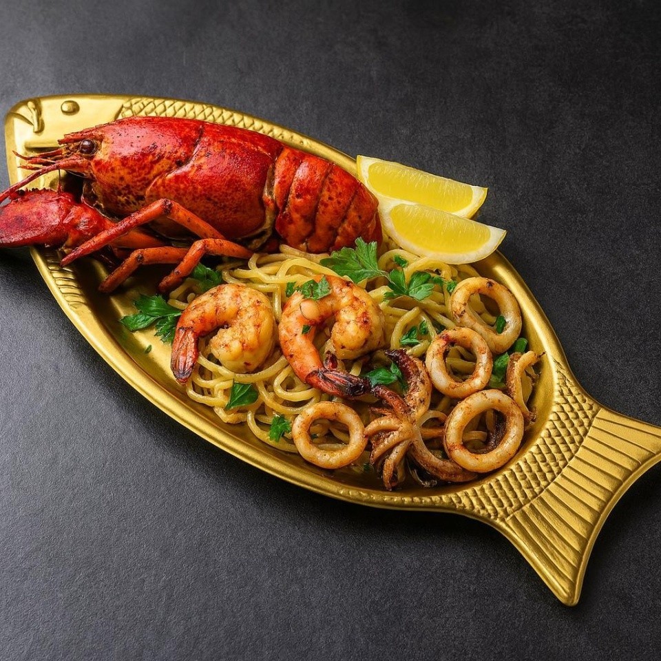 Adaugă eleganță și rafinament meselor tale cu acest platou metalic în formă de pește, ideal pentru servirea preparatelor din pește, fructe de mare sau diverse aperitive.