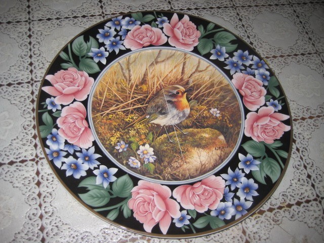 Platou portelan cu mijloc avand foto cu pui si margine din portelan cu desene cu trandafiri, 30 cm.