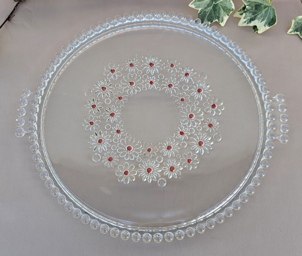 PLATOU CIRCULAR VINTAGE MARE DIN STICLA MASIVA PUTIN ÎNALT CU DOUA ANSE SI MODEL FLORAL. STARE DE CONSERVARE:PREZINTA CATEVA URME DE UZURA (ZGÂRIETURI - ULTIMA FOTO)