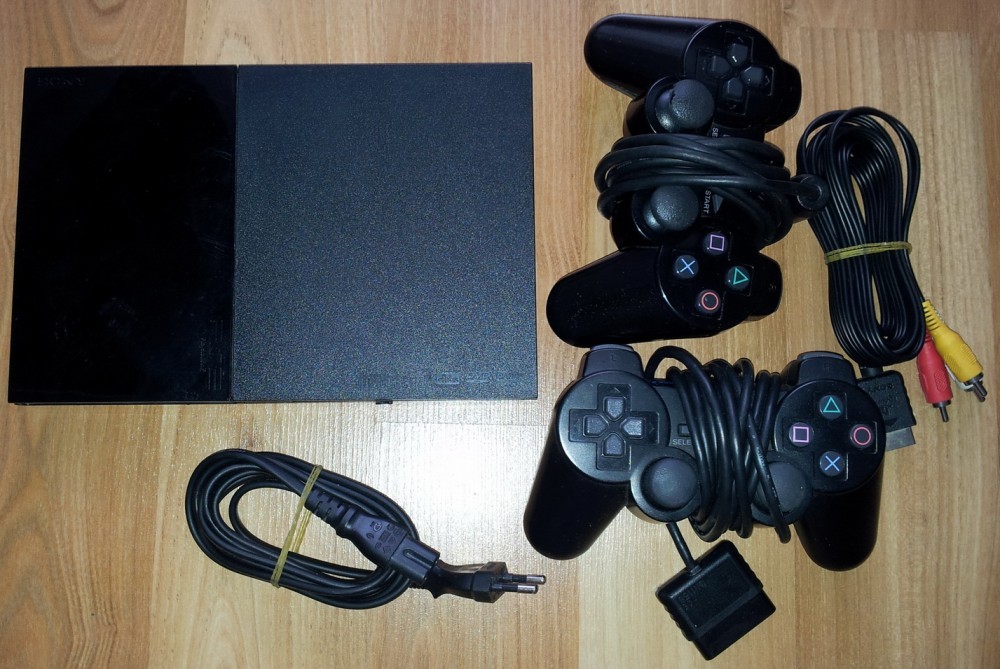 Playstation 2, slim, model 90004 (pe partea lucioasa este zgariat), modat modbo750, 2 joystikuri (cauciucul de la un analog este un pic rupt), cablu alimentare, cablu video, 2 jocuri