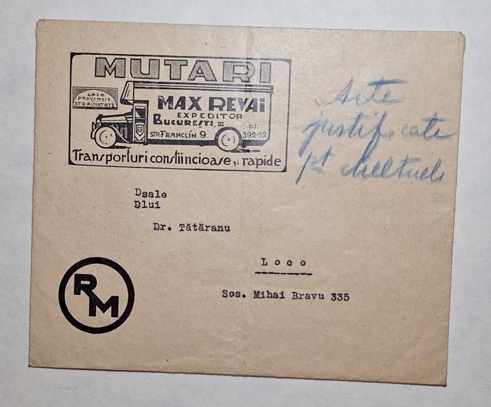 Plic publicitar interbelic Max Revai București – transporturi rapide, rar