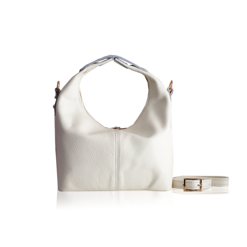 Poșetă Mitsi crem din piele naturală. Detalii produs: Dimensiuni: 24(h)× 22(l) x 12(p) cm Material: piele naturală Culoare: crem Închidere cu fermoar Buzunar interior Logo în reflief Căptușeală din satin Curea din piele detașabilă Lucrată manual Made in Greece Este o geantă de mână din piele cu un design arhitectural unic. Cele două mânere sunt extinse și unite într-un cerc sub sigla BonendisLogo în relief . Pe partea laterală a acestui model frumos este plasată o curea din piele reglabilă, cu cusături elegante și detaliate.