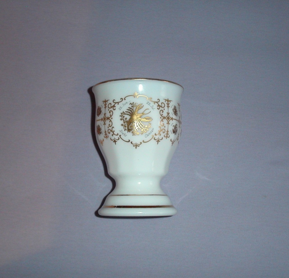 Pocal din sticla alba, arcopal cu horoscop (Rac), cu inaltimea de 12.2 cm si 8 cm deschiderea gurii. Este decorat cu horoscop imprejur, dar este pentru (Rac), folosit in stare buna