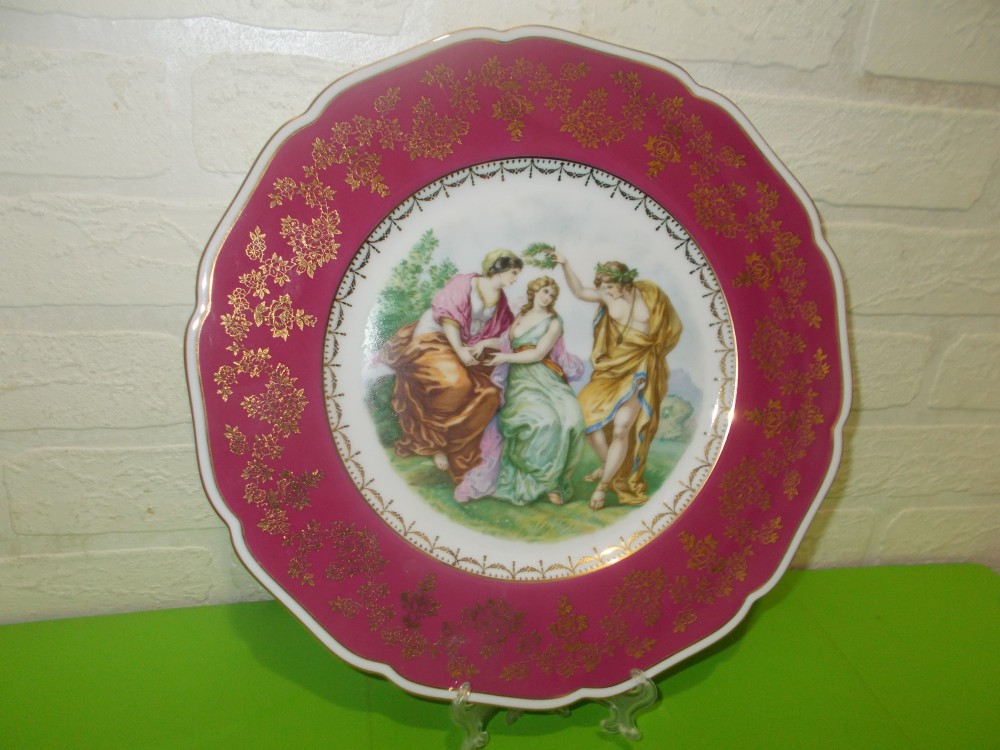 Este o piesa deosebita , de colectie, o farfurie decorativa realizata din portelan german Aeldeste Hutschenreuther Hohenberg seria “Madeleine”, decorata cu un medalion central in care este o scena mitologica. Zona periferica este decorata cu aur coloidal. Pe verso este marcajul producatorului german (foto).