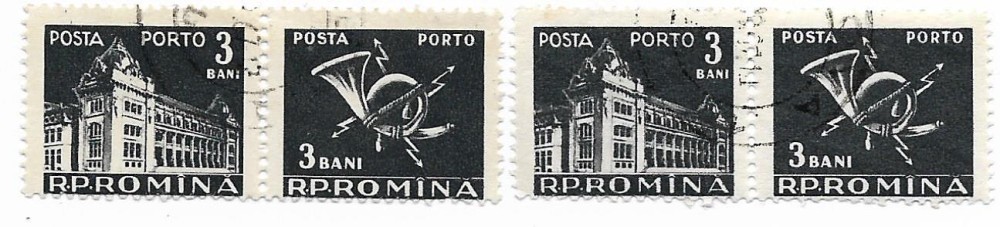 Porto duble - Palatul P.T.T. si Goarna, 3 B x 2 buc., obliterate, 1957. Stare foarte buna.
