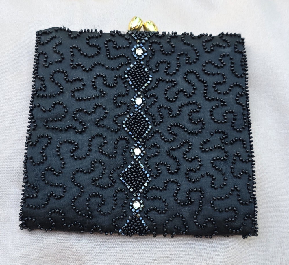 Portofel vintage din mătase naturală neagră, decorat manual cu mărgele