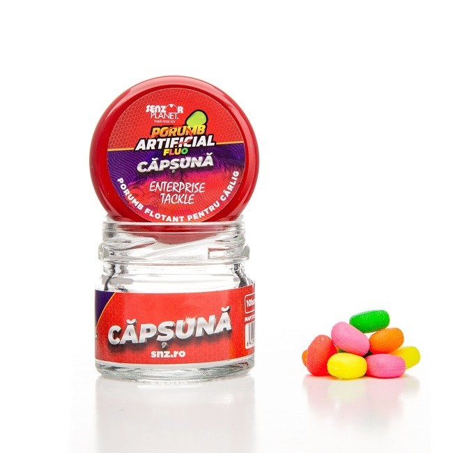 <p><span style="font-weight: bold;">PORUMB ARTIFICIAL SENZOR CAPSUNA FLUO 10buc</span></p><span style="font-weight: bold;">Boabele de porumb Enterprise Tackle sunt ambalate si personalizate cu arome Senzor Planet. Boabele flotante sunt importate din Anglia, iar proprietatile absorbante si de flotabilitate ale materialului il recomanda ca fiind una dintre cele mai cautate momeli din Europa.Se recomanda folosirea lor pe riguri cat mai scurte (maximum 10 cm), astfel incat momeala artificiala sa fie in zona naditorului.Atentie la echilibrarea monturii, carligul trebuie sa stea pe substrat si doar boabele sa fie deasupra lui!Intr-un borcan sunt 10 boabe de porumb artificial: 2 roz fluo, 2 rosu fluo, 2 portocaliu fluo, 2 verde fluo, 2 galben fluo.</span>