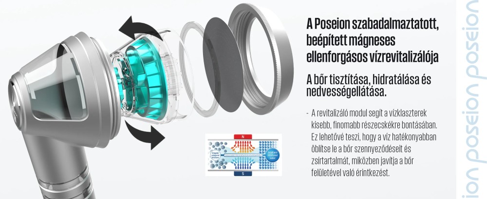 Ez a három technológiai elem együtt garantálja a páratlan zuhanyélményt és bőrmegújító hatást. Ezáltal a Poseion víz „ionizált” és „lágyított”, ami segíti a bőr természetes olajháztartásának egyensúlyát, csökkenti az irritációt és a korpásodást, miközben fényt ad a hajnak.