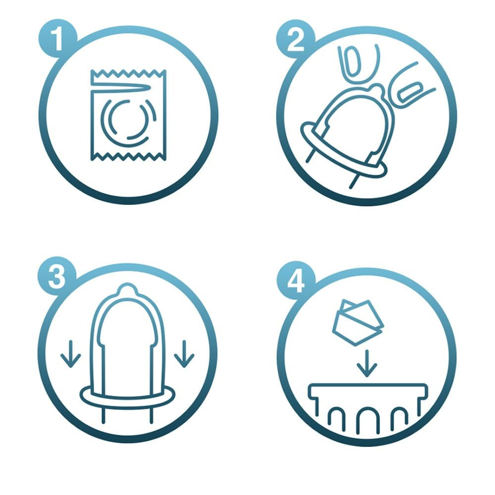 Utilizare: Pasul 1 Rupe ambalajul pornind de la o latura zimtata si scoate cu grija prezervativul, deoarece poate fi deteriorat de unghii sau obiecte ascutite (bijuterii sau piercing-uri). Pasul 2 Verifica daca prezervativul este rulat spre exterior. Daca este rulat spre interior, inseamna ca este pe dos. Strange capatul inchis al prezervativului pentru a te asigura ca nu ramane aer in interior. Pasul 3 Continuand sa strangi capatul inchis, aseaza prezervativul pe varful penisului si ruleaza-l in jos cu cealalta mana. Daca incepe sa se ruleze inapoi in timpul actului sexual, ruleaza-l la loc imediat. Daca iese cu totul, opreste-te si pune alt prezervativ. Imediat dupa ejaculare, cat timp penisul este inca in erectie, prezervativul trebuie tinut ferm la baza penisului, inaintea retragerii acestuia, pentru a preveni alunecarea. Pasul 4 Dupa retragerea penisului, scoate pur si simplu prezervativul, impacheteaza-l intr-un servetel si arunca-l in cosul de gunoi. Nu il arunca in toaleta. |