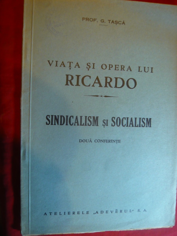 Prof.G.Trasca - Viata ,Opera lui Ricardo/ Sindicalism si Socialism -2 Conf.1935 ,Ed. Adevarul , cu stampila Directiei Centrale a PNT ,