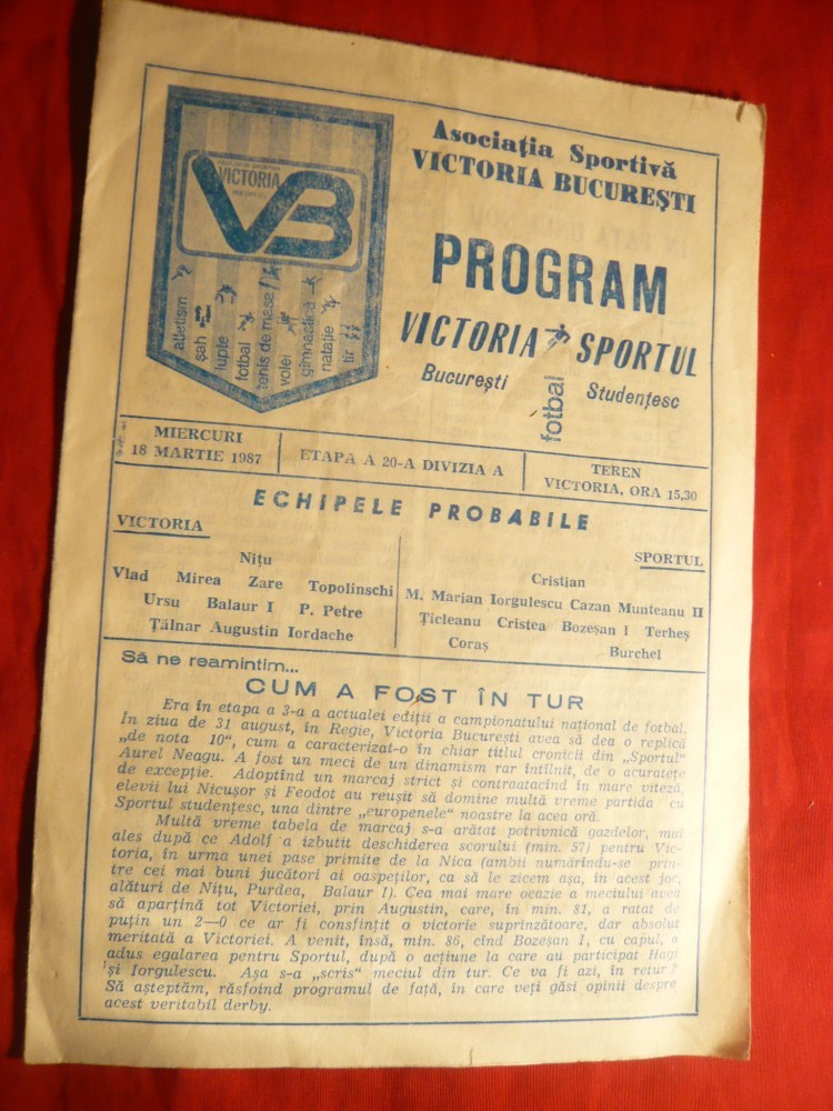 Program Fotbal -Meciul Victoria- Sportul Studentesc 16 martie 1987 , 8 pag.