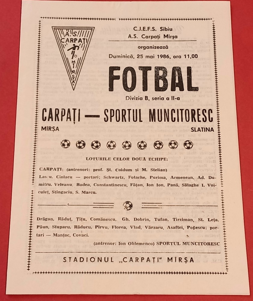 Program meci fotbal AS "CARPATI" MIRSA-SPORTUL MUNCITORESC SLATINA(25.05.1986)