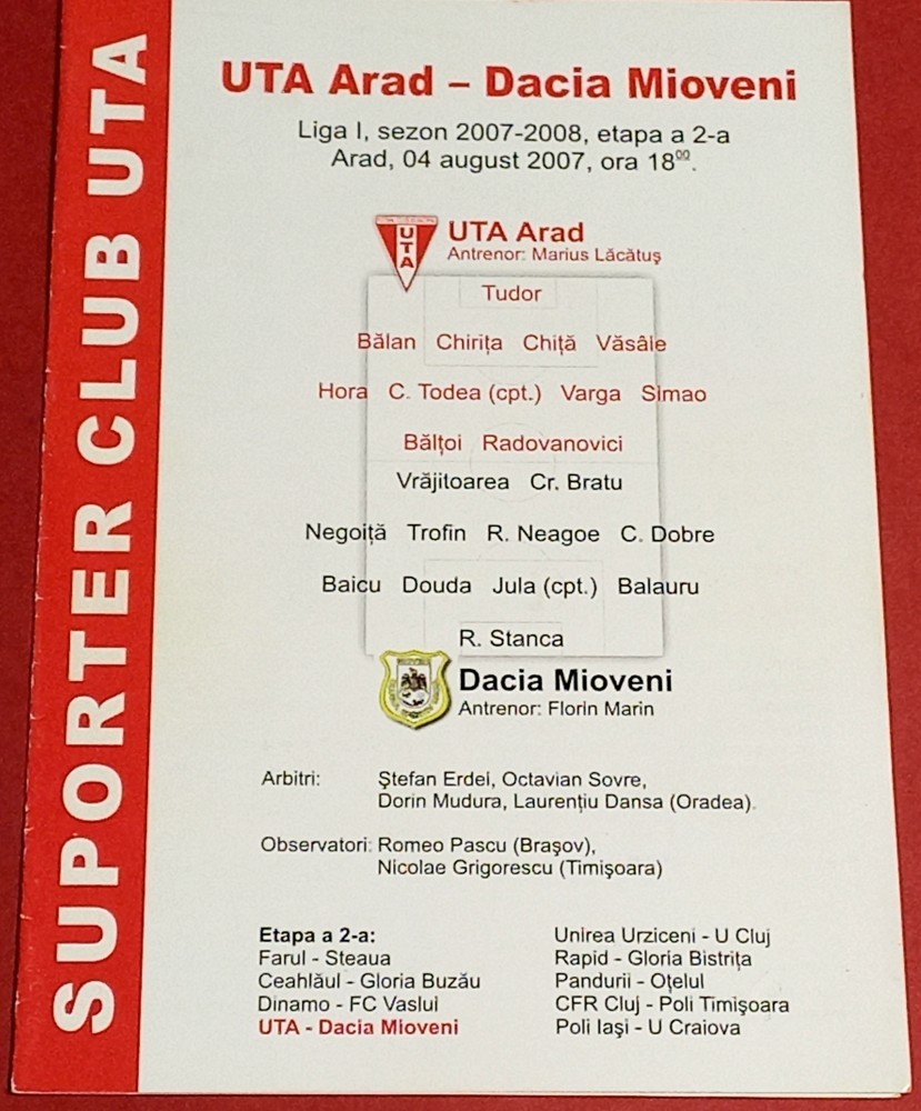 Program meci fotbal UTA ARAD - "DACIA" MIOVENI (04.08.2007)
