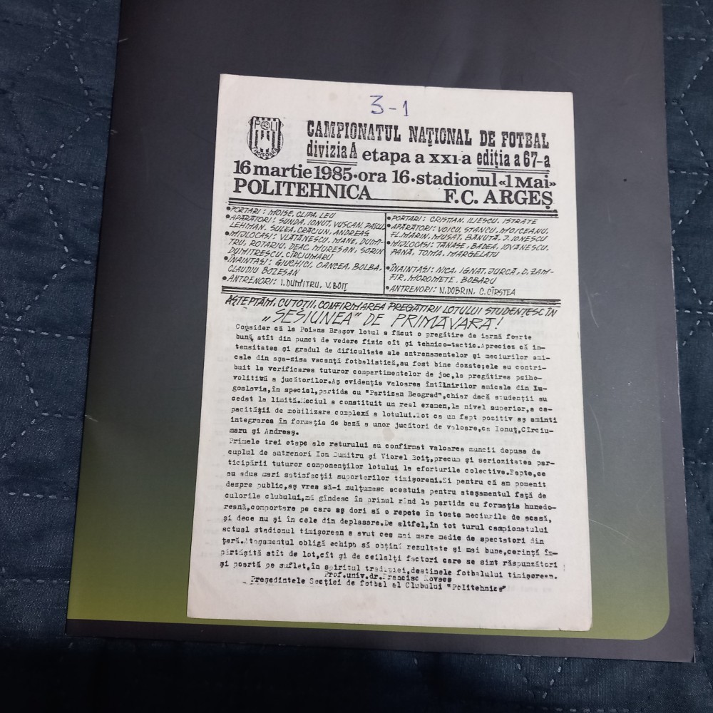 program de la meciul disputat in data de 16 03 1985
