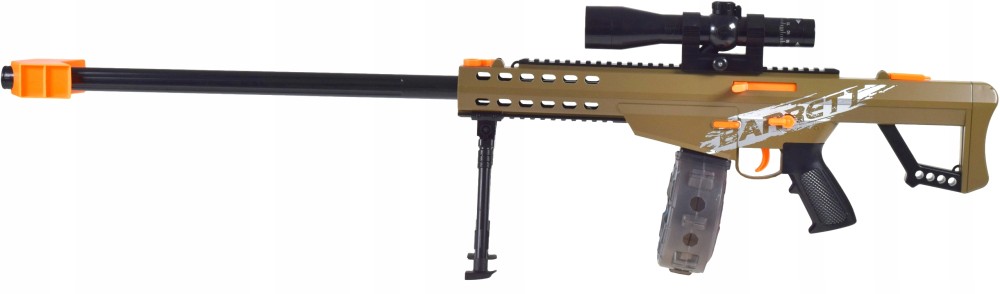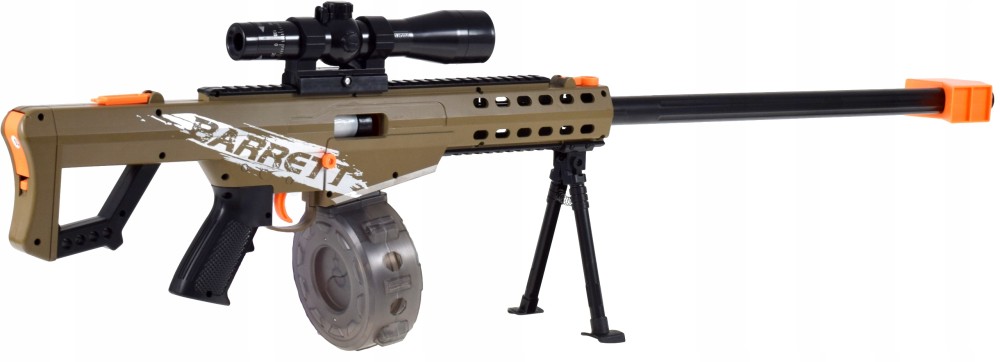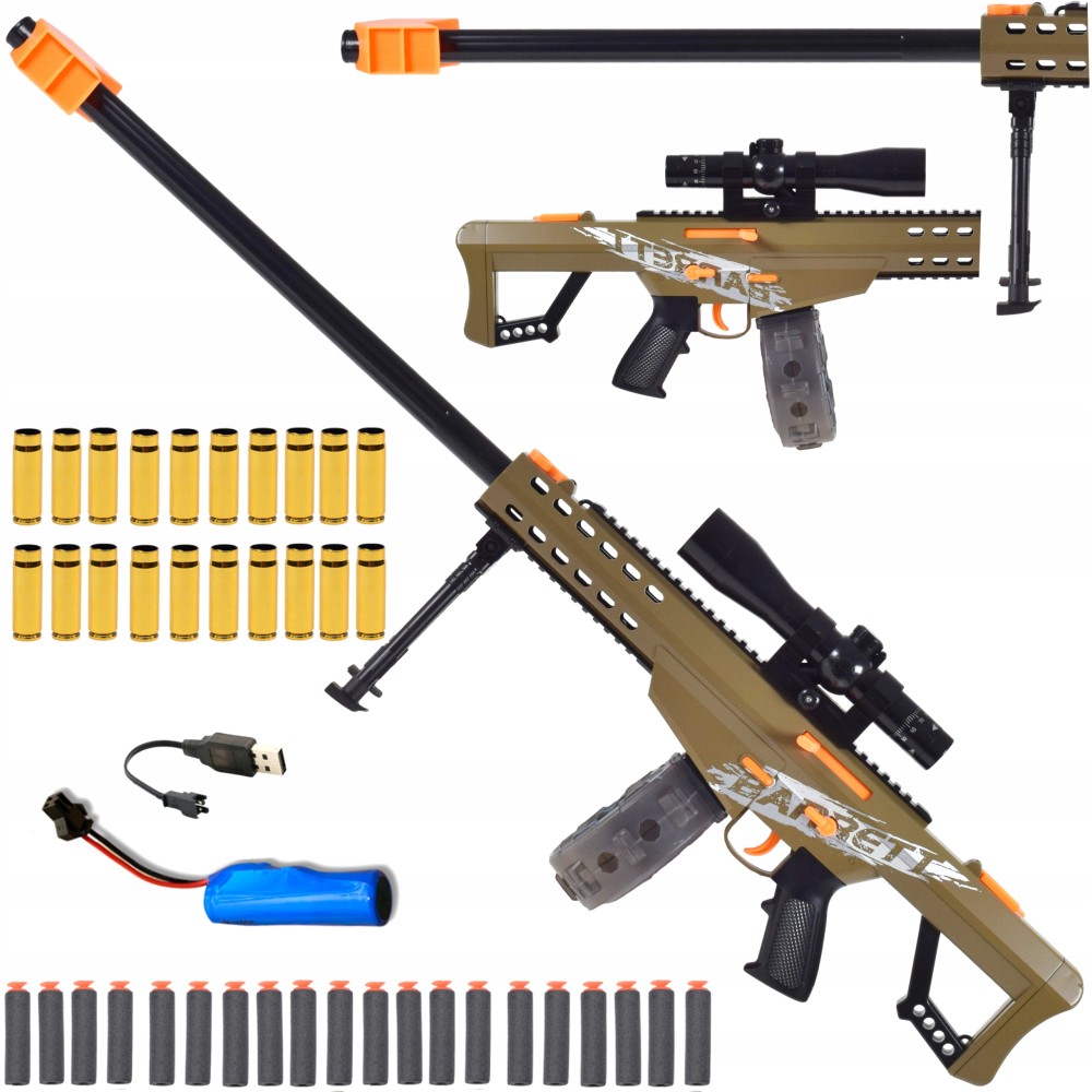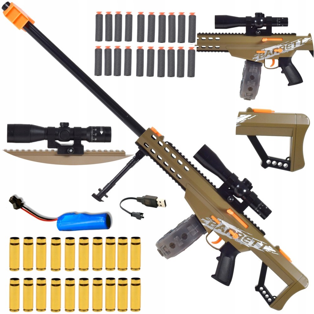 Aspectul realist, greutatea solidă și ejectarea cartușelor după tragere fac jocul și mai interesant. Pușca trage săgeți din spumă sigure și nu necesită baterii. Setul include lunetă, curea, 20 de săgeți, 8 cartușe și bipied – toate ambalate într-o cutie atractivă, perfectă pentru un cadou!