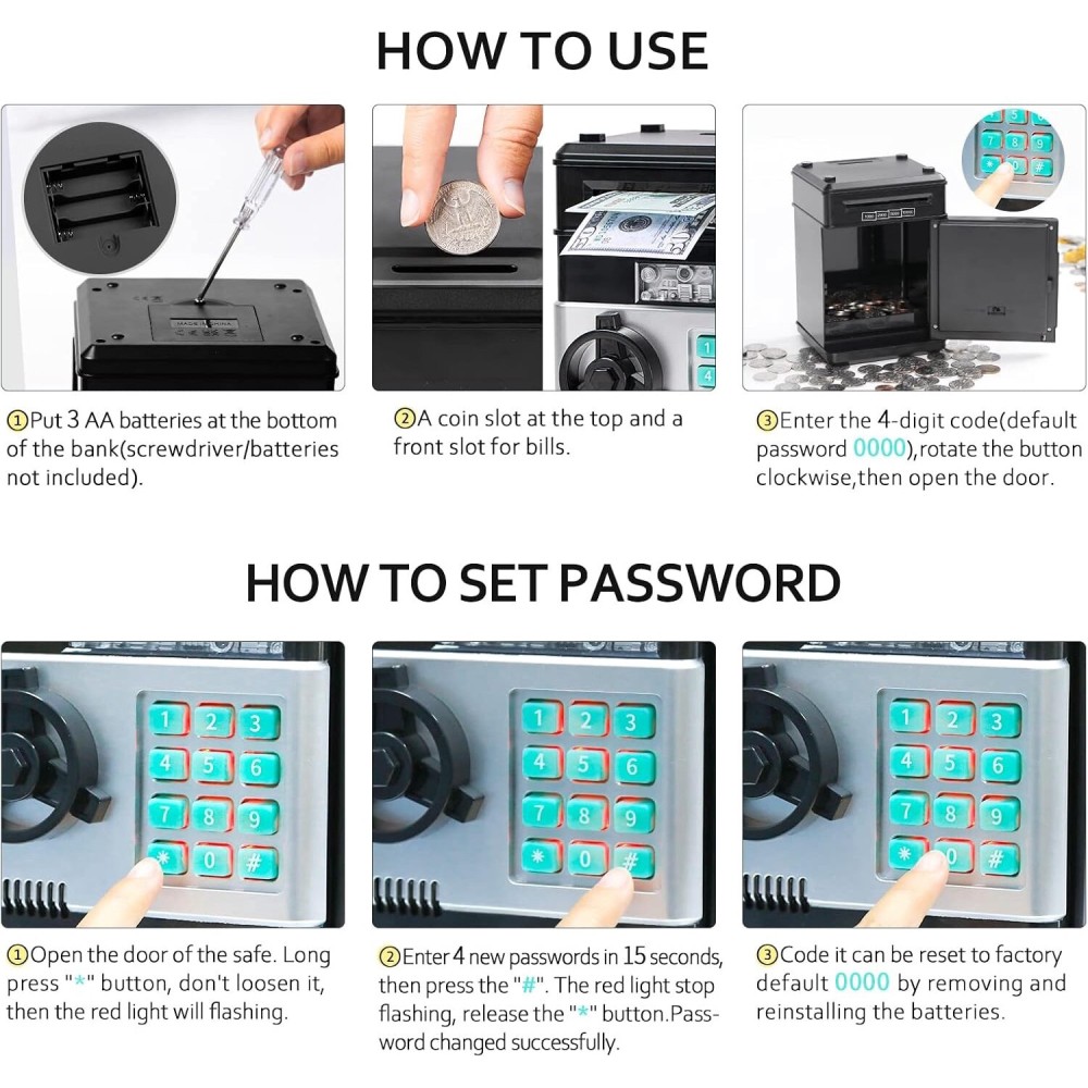 Fabricata din ABS durabil, fara miros si rezistent la uzura, pusculita este robusta si sigura pentru copii, fiind potrivita pentru utilizare zilnica. Modelul reproduce functionalitatea unui seif adevarat, cu un sistem de deschidere protejat prin parola din 4 cifre. La introducerea parolei corecte, LED-ul verde se aprinde, iar usa poate fi deschisa prin rotirea manerului. Parola implicita este „0000”, dar poate fi schimbata cu usurinta pentru un plus de realism si securitate.