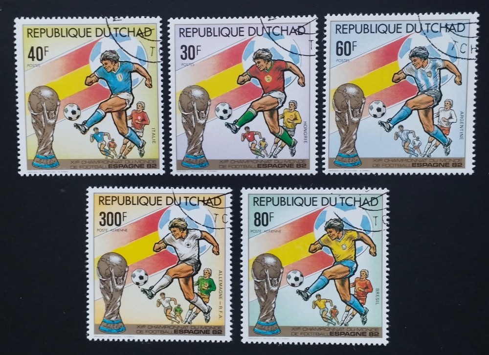 R.DU TCHAD-CAMPIONATUL MONDIAL DE FOTBAL SPANIA-1982-SET 5 V.-OBLITERAT-DANTELAT-CTO - EP 202