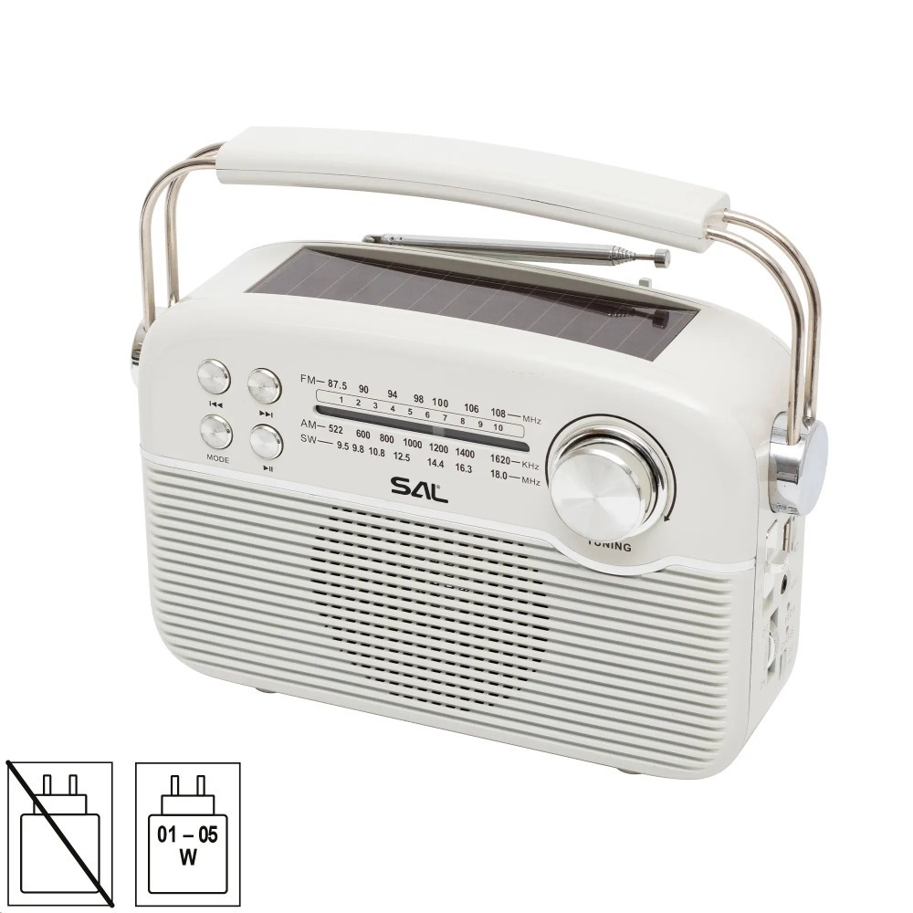 Radio hibrid AC-DC /SOLAR FM-AM-SW Bluetooth SAL RPR9. Radio hibrid cu incarcare solara RPR9 - FM AM SW, BT, USB, microSD, AUX Radio portabil multifunctional RPR9, ideal pentru acasa sau calatorii. • Player multimedia complet: asculti muzica prin BT, USB, microSD sau AUX (3.5mm) • Radio cu 3 benzi: FM / AM / SW pentru receptie extinsa • Conectivitate wireless Bluetooth – redare muzica direct de pe telefon sau laptop • Suport redare muzica de pe stick USB sau card microSD • Intrare audio AUX cu fir pentru conectarea altor dispozitive audio • Functionare fara baterii – alimentare duala: acumulator Li-ion incorporat sau baterii 2xD/LR20 (neincluse) • Incarcare hibrida: panou solar, cablu USB sau priza • Functioneaza chiar si cand acumulatorul este descarcat – cu baterii • Autonomie extinsa: incarcare ~5 ore, functionare continua ~21 ore • Design compact si robust – ideal pentru camping, excursii sau situatii de urgenta • Include cablu alimentare • Dimensiuni: 228x150/195x85 mm | Greutate: 1030 g Cuvinte cautate in site: radio portabil cu incarcare solara, radio hibrid FM AM SW, radio solar cu bluetooth, radio USB microSD AUX, radio camping cu acumulator, radio multifunctional incarcare solara