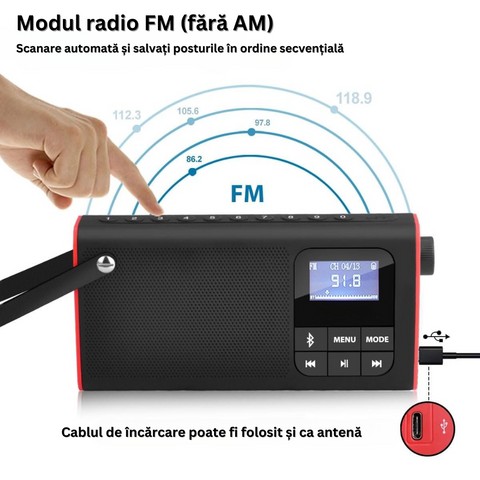🔊 Radio Portabil Multifuncțional – FM, Boxă Bluetooth, Ecran LCD, Card SD, AUX 🔊