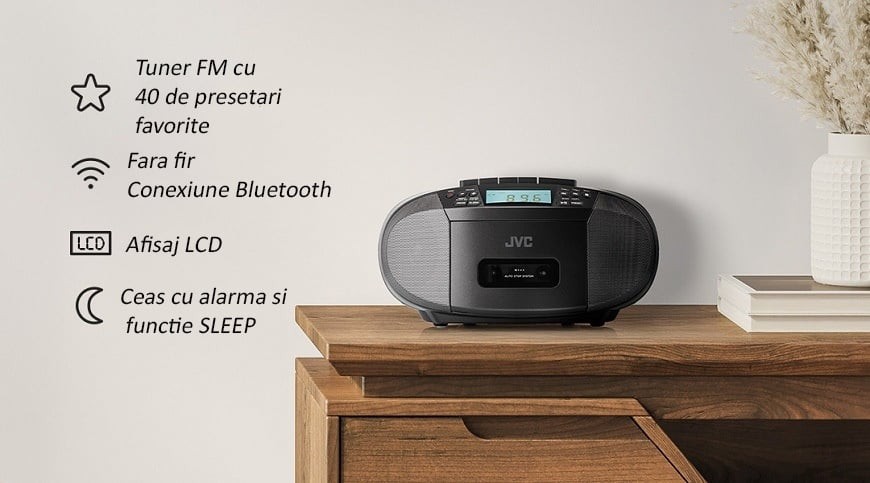 Radiocasetofon stereo cu CD JVC RC-E444B, 4W RMS, Bluetooth, USB, afisaj LCD,