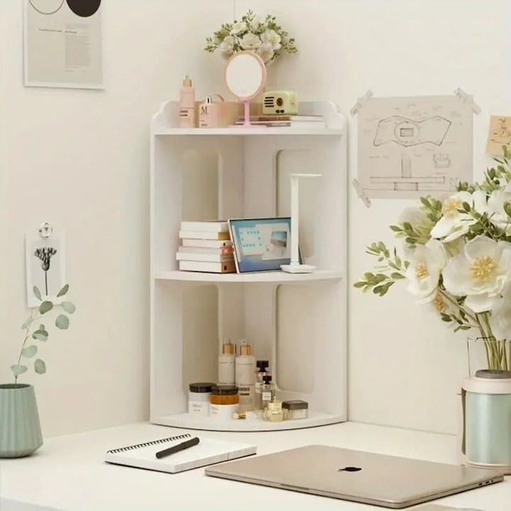 Raft de colt, multifunctional, pentru birou, baie, cu 2 etajere, dimensiuni 60x24x24cm, din MDF, alb