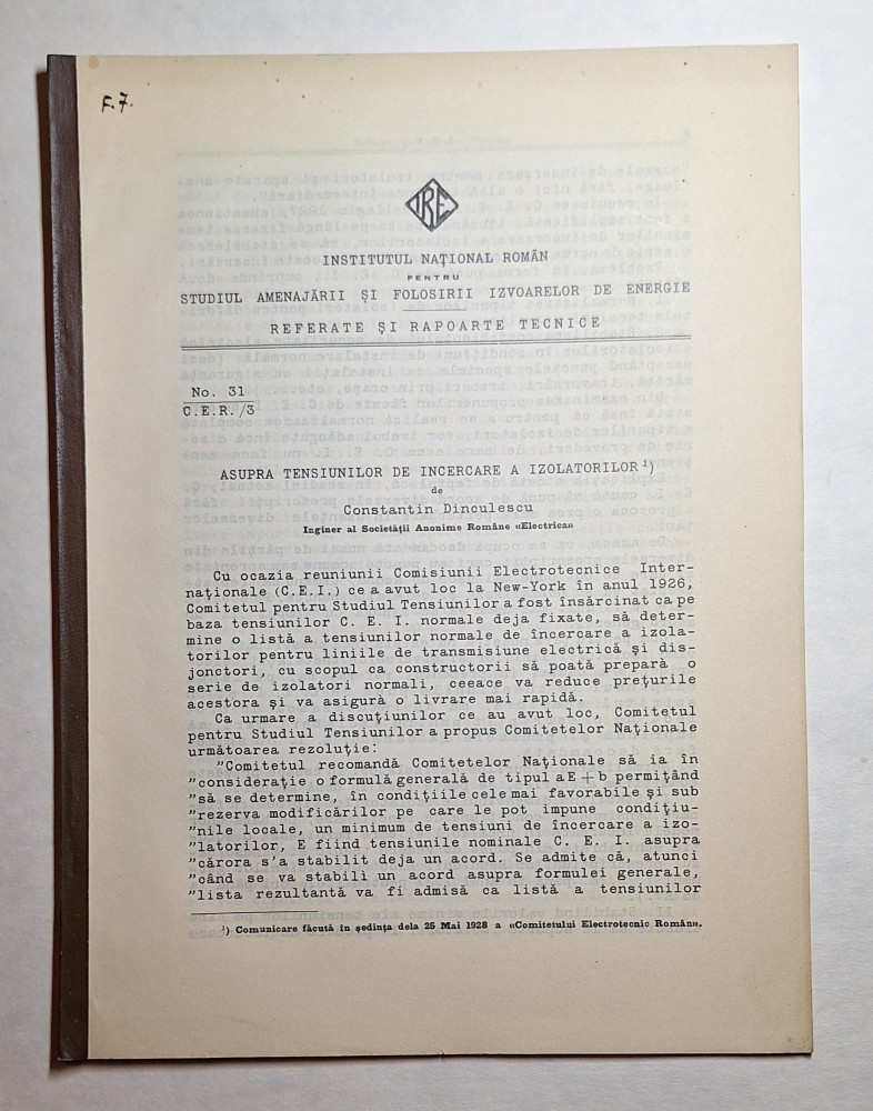 Rapoarte Tehnice I.N.R./I.R.E. No. 31 C.E.R./3 „Asupra Tens. de Încercare a Izolatorilor” interbelic