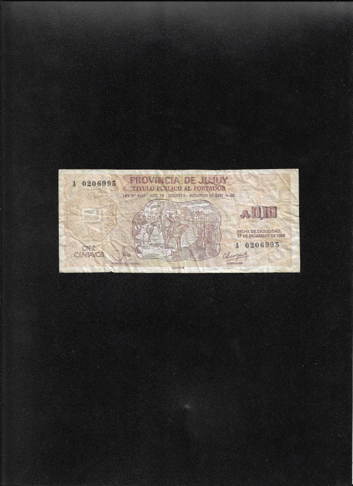 Rar! Argentina 10 centavos 0,10 austales 1988 Jujuy seria0206995