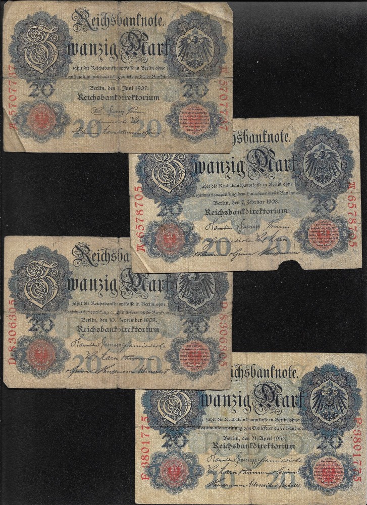 Rar! Set Germania 4 x 20 marci mark 1907 + 1908 + 1909 + 1910
