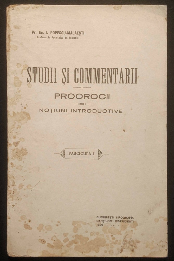 ✝ rara 1926 STUDII si COMENTARII. PROROCII. Preot Ec. I Popescu-Malaesti 88 pagini netaiate Fasc 1 Tabele SINCRONISTICA Brosata. Stare conform pozelor