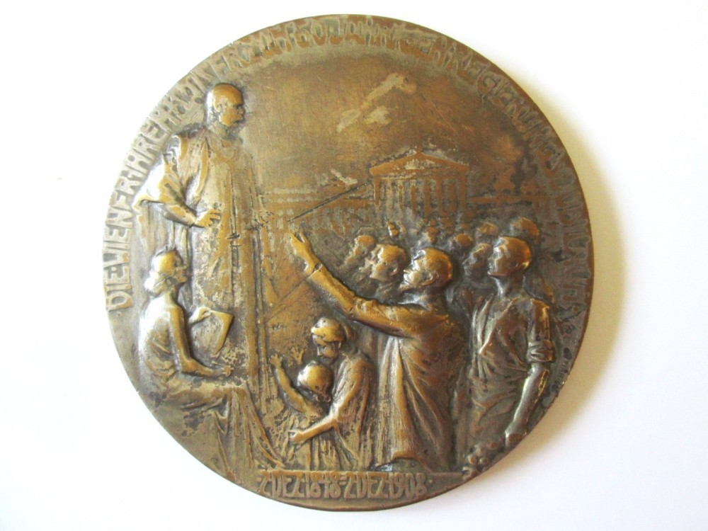 Rara! Medalie mare Austro-Ungaria: Viribus Unitis,60 ani de domnie Franz Josef 1848-1908,diametrul=85 mm,greutate=198 grame!