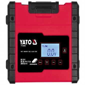 Redresorul este un dispozitiv care permite încărcarea diferitelor tipuri de acumulatori. Redresorul converteşte curentul şi tensiunea din reţeaua electrică, la parametrii care permit încărcarea în condiţii de siguranţă a acumulatorului. Atunci când este încărcat acumulatorul funcţionează în corespunzător, iar acest lucru extinde semnifi cativ durata de exploatare a acumulatorului. Redresorul este dodat cu protecţie anti scurtcircuit şi protecţie împotriva supraîncărcării acumulatorului. Funcţionarea corespunzătoare, fi abilă şi în condiţii de siguranţă a aparatului depinde de exploatarea adecvată, de aceea: Înainte de a începe exploatarea dispozitivului trebuie să citiţi toate instrucţiunile şi să le păstraţi. Furnizorul nu va răspunde pentru pagubele cauzate de nerespectarea normelor de siguranţă şi a recomandărilor din aceste instrucţiuni. Indicatoarele montate pe carcasa dipozitivului nu sunt aparate de măsurare în sensul legii: „Legea metrologiei” INFORMAŢII TEHNICE Parametru Unitate de măsură Valoare Nr catalog YT-83003 Tensiune de reţea [V a.c.] 220 - 240 Frecvenţă reţea [Hz] 50 Intensitatea nominală a curentului [A] 1,8 Tensiune nominală de încărcare [V d.c.] 12 Curent de încărcare (gamă tensiune) [A] 2 / 8 / 15 Capacitate acumulator [Ah] 5 - 200 Clasă izolare II Nivel protecţie IPX0 Masa [kg] 1,8