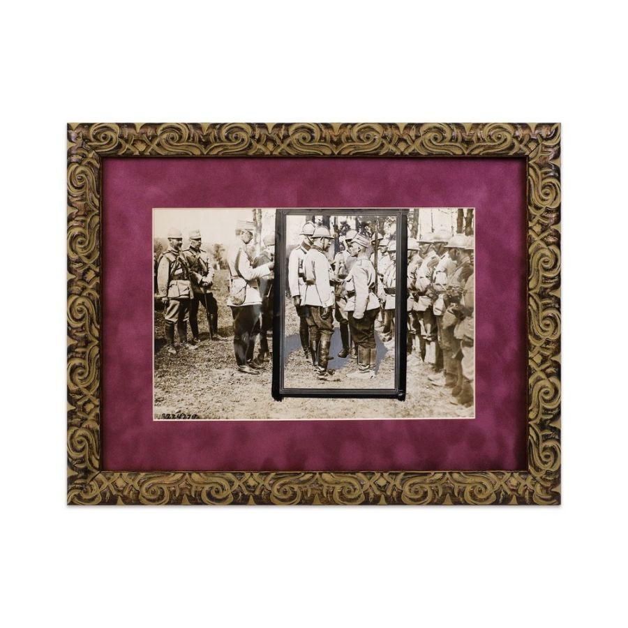 Fotografie de presă care îl surprinde pe regele Ferdinand I discutând cu unul din soldații care au participat la bătălia de la Mărășești din toamna anului 1917. Alături de rege îl regăsim pe principele moștenitor Carol. Fotografia este datată pe verso 22 august 1917. Fotografia vine înrămată într-o ramă contemporană.