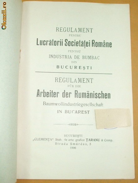 Regulament-Lucratorii Soc. din Industrai Bumbacului-1906