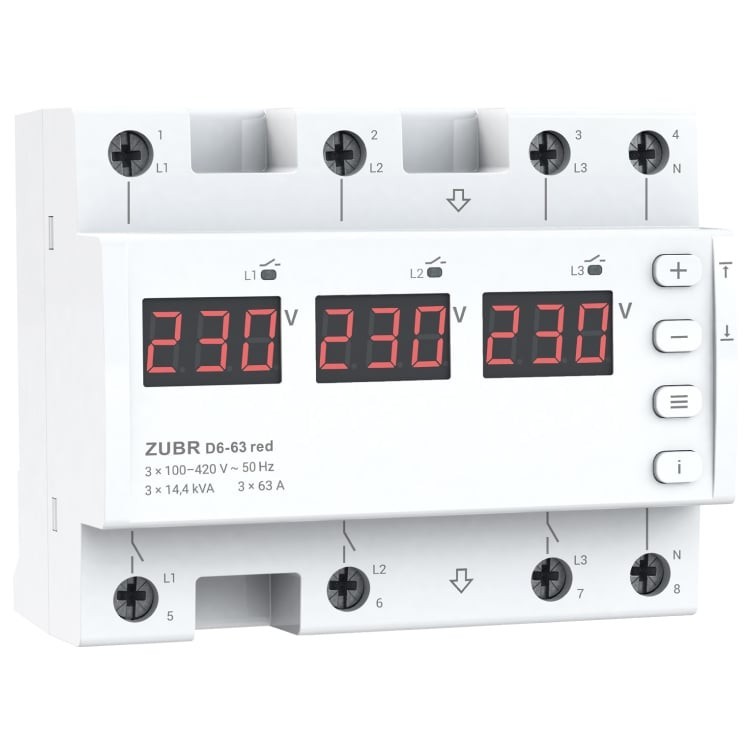 - În modul cu sarcină trifazată, releul protejează împotriva supratensiunilor critice în rețea, a asimetriei, a întreruperii unei faze (funcția poate fi dezactivată), controlează ordinea alternării fazelor (funcția poate fi dezactivată) și, în cazul unui accident pe una dintre faze, toate fazele sunt deconectate. În acest mod, ZUBR D6 roșu poate fi utilizat în locul unui releu trifazat cu contactor!