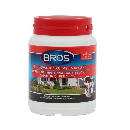 Bros Caini si Pisici Repellent Extra confera protectie naturala si siguranta in utilizare. Produsul respinge animalele de companie si cartitele datorita mirosului puternic emanat. Se utilizeaza in gradini, curti, parcuri, locuri de joaca pentru copii - in zonele frecventate de caini si pisici. Mirosul puternic indeparteaza cainii si pisicile dar nu este daunator pentru plante.