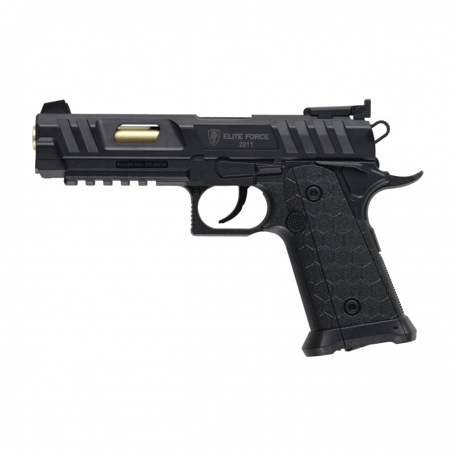 Replica Elite Force 2011 CO2 Umarex este o replica imbunatatita a clasicului colt 1911, adaptata pentru cerintele moderne printr-o serie de optimizari ergonomice si modificari functionale. Manerul a fost modificat si include un canal care usureaza introducerea incarcatorului incapator, iar plaselele au o textura antialunecare tip fagure. De asemenea, pe manson au fost adaugate decupaje, crescand suprafata de prindere pentru o armare mai confortabila. Versiunea aceasta are un sistem de propulsie pe co2, iar datorita lipsei sistemului de recul, intreaga energie a gazului este folosita pentru propulsarea bilei.